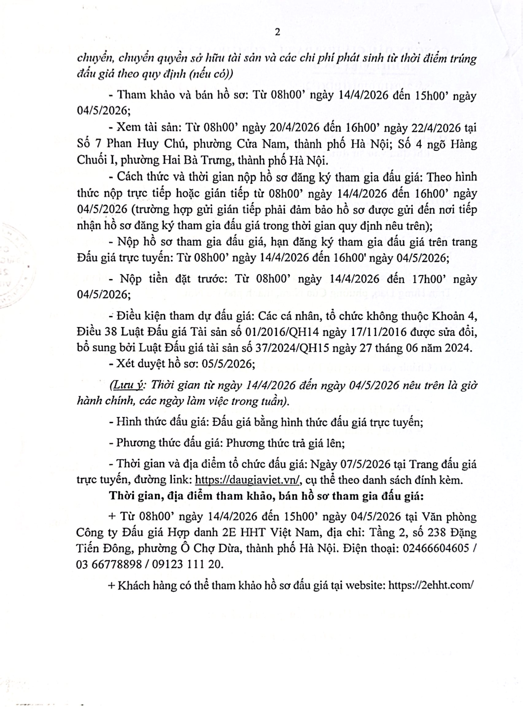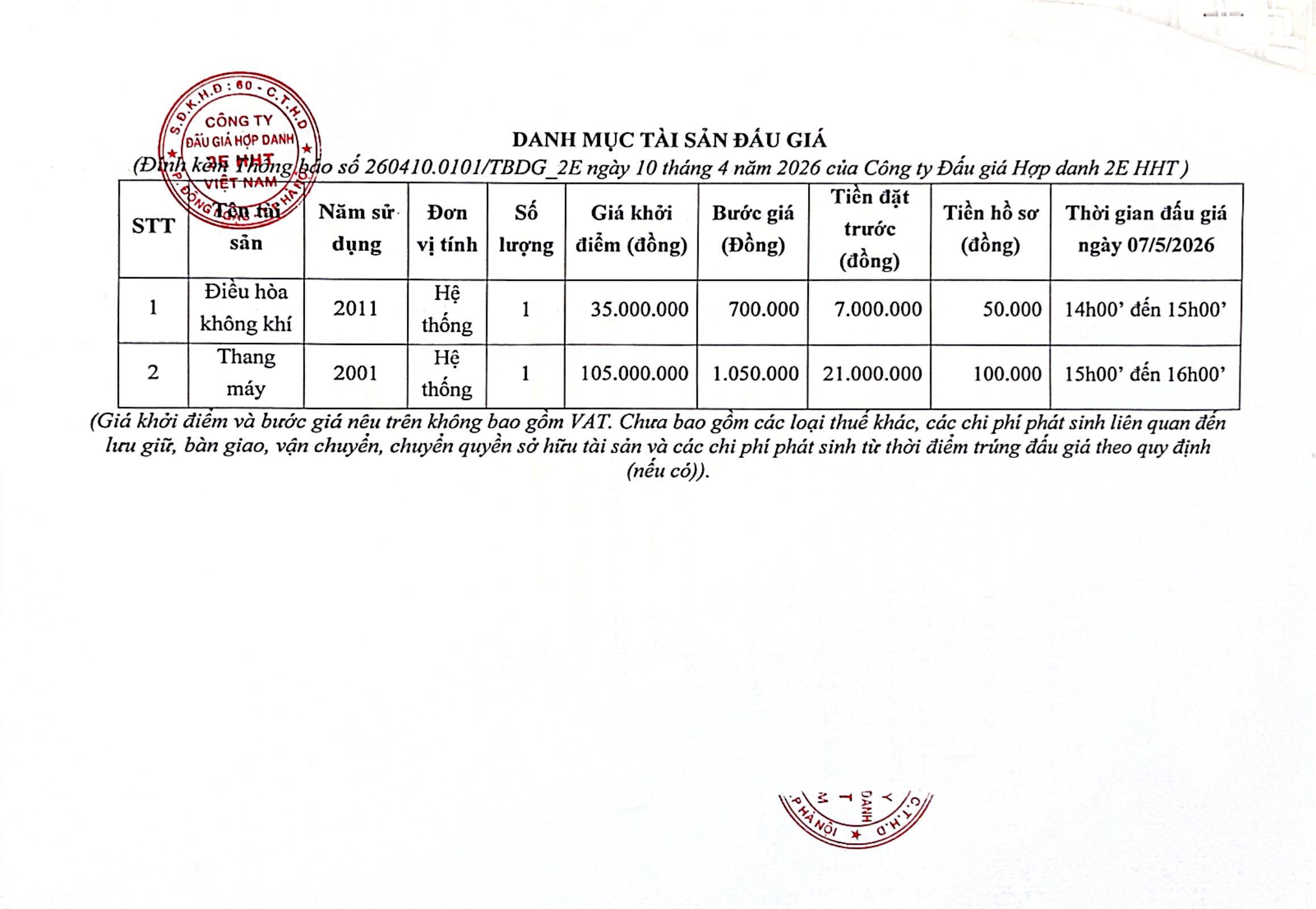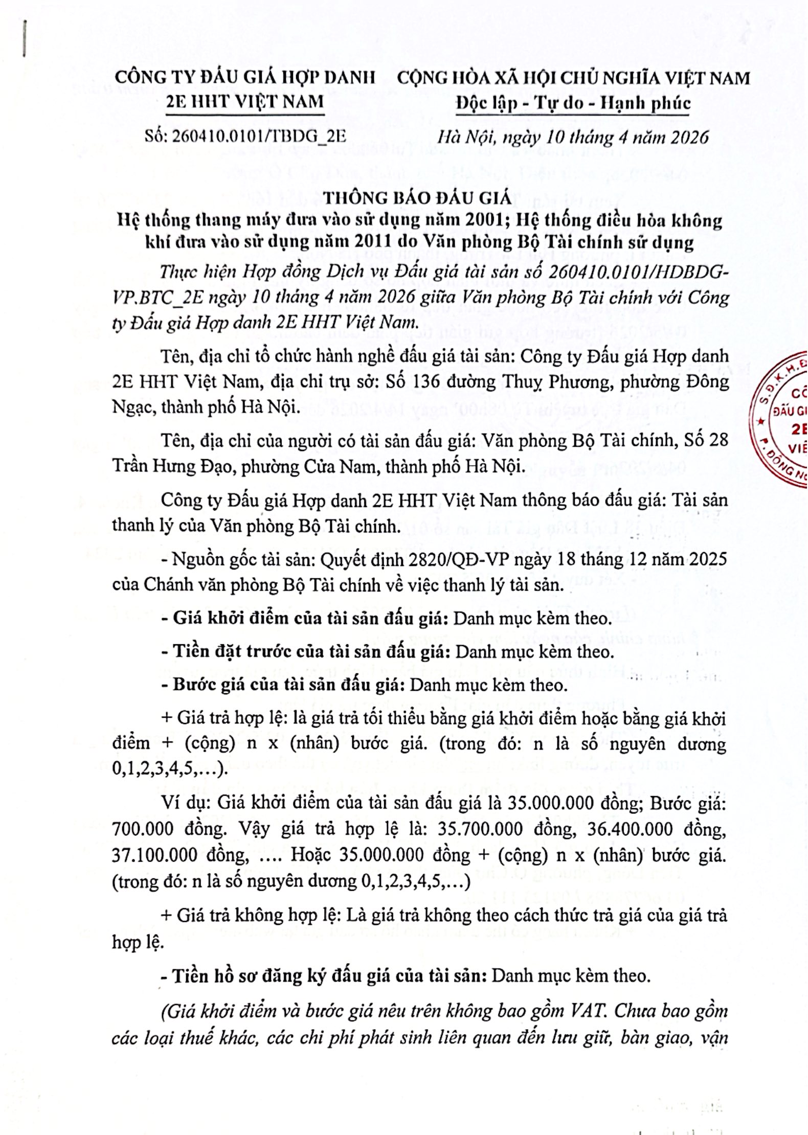Công ty Đấu giá Hợp danh 2E HHT Việt Nam Thông báo đấu giá: Hệ thống thang máy đưa vào sử dụng năm 2001; Hệ thống điều hòa không khí đưa vào sử dụng năm 2011 do Văn phòng Bộ Tài chính sử dụng