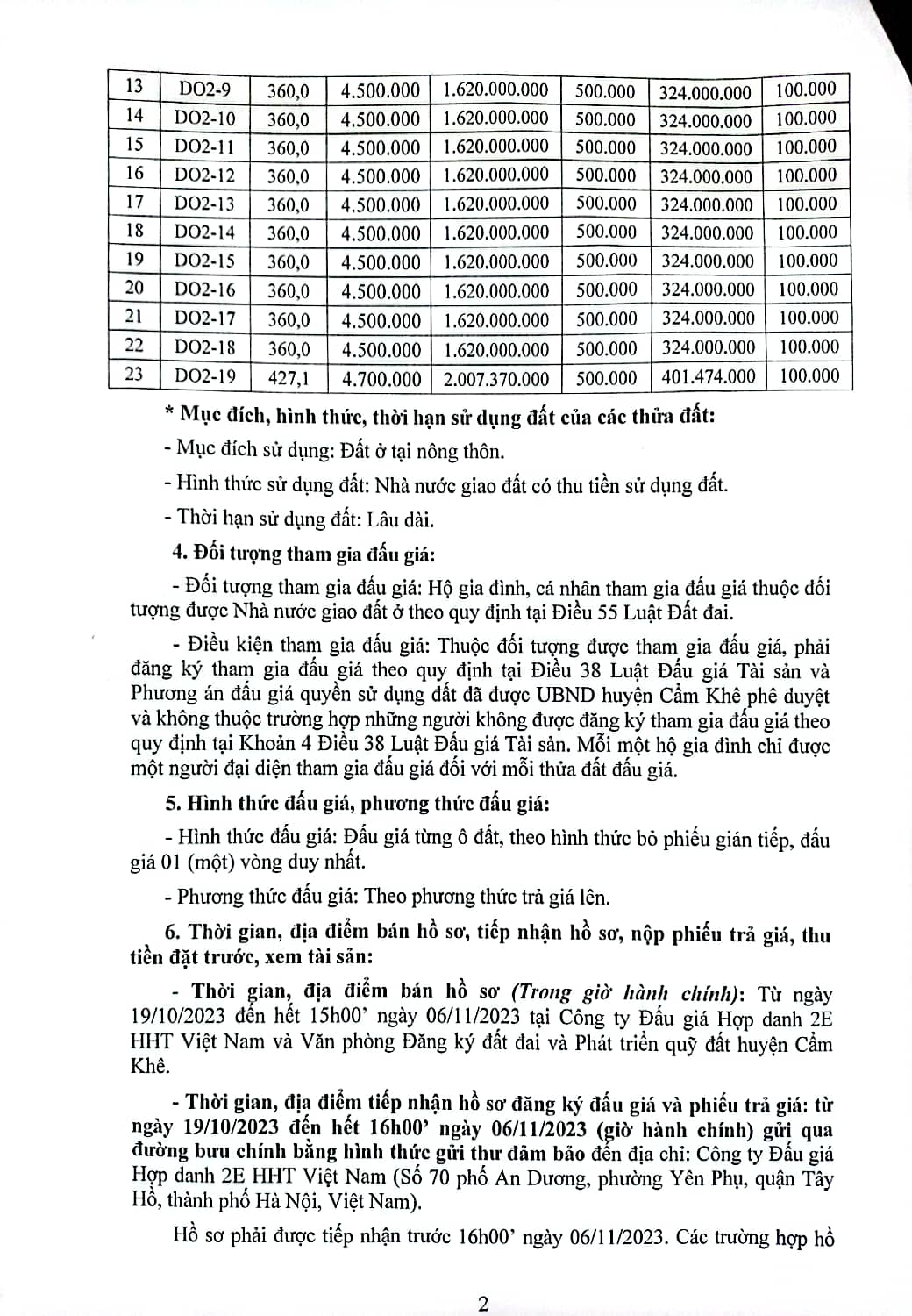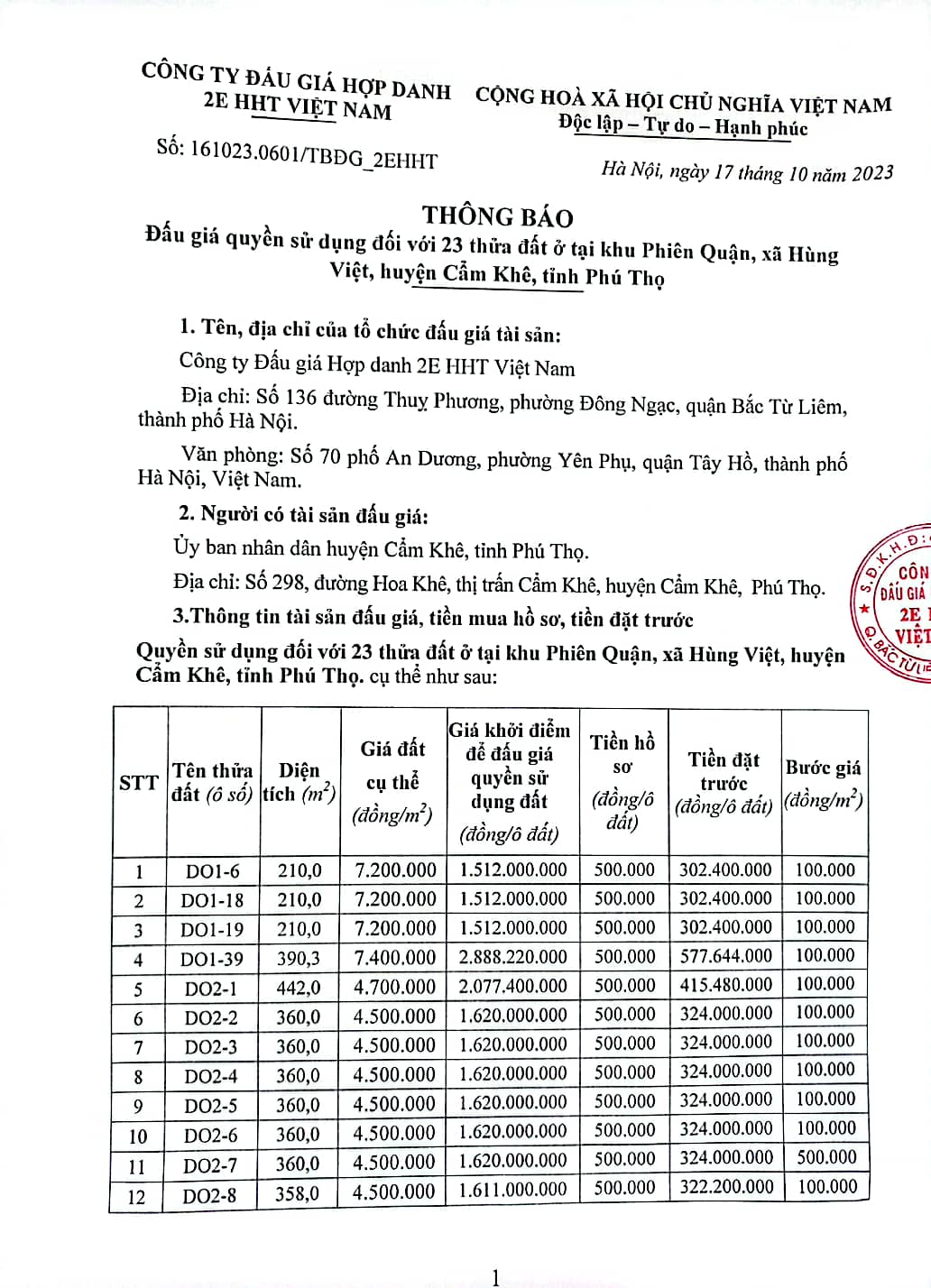 Công ty Đấu giá Hợp danh 2E HHT Việt Nam thông báo
