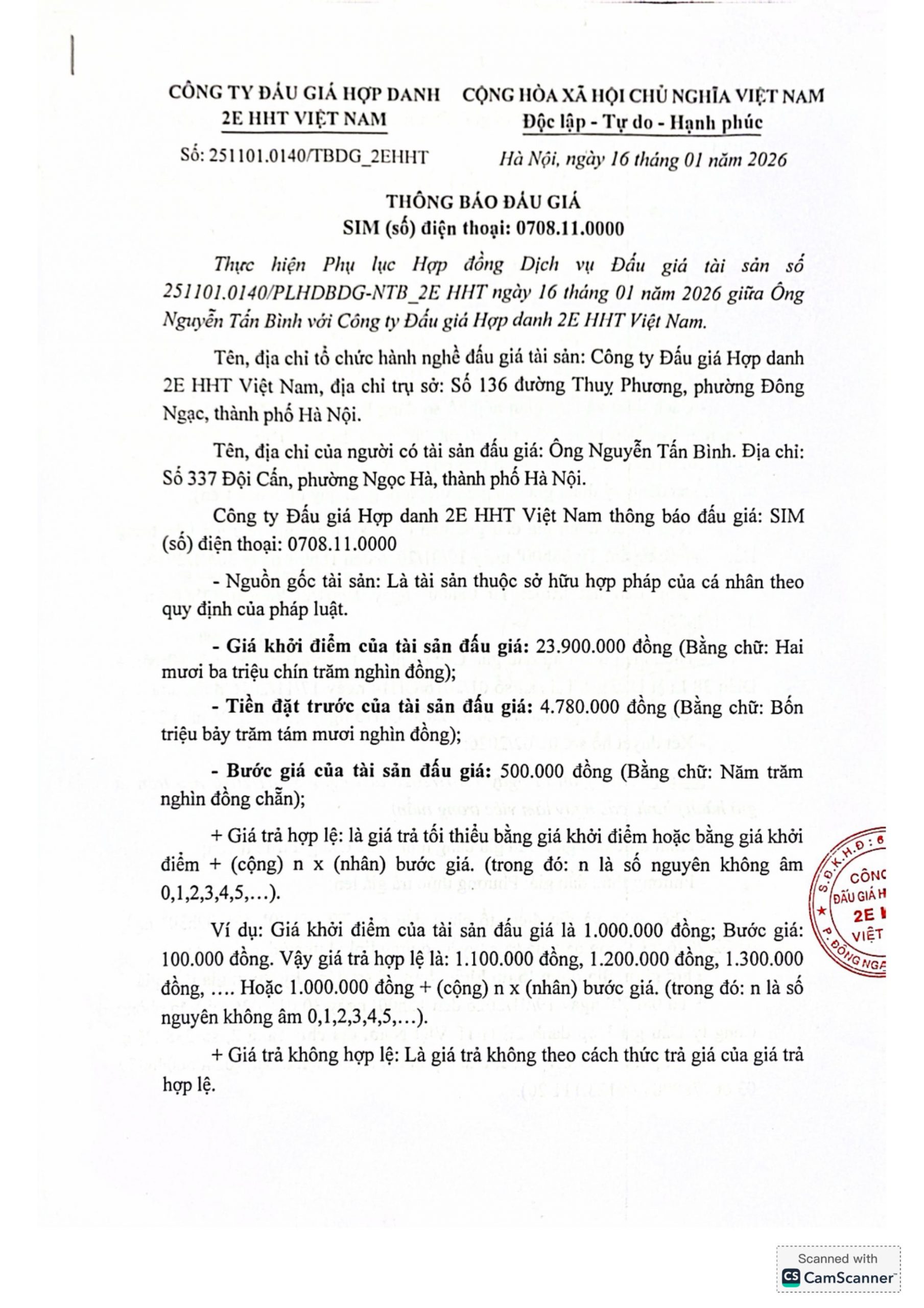 Công ty đấu giá hợp danh 2EHHT Việt Nam Thông báo đấu giá: SIM (số) điện thoại: 0708.11.0000